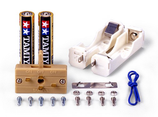 プラスチック製電池ボックスが2つとコンパクトな組み立て式の逆転スイッチ1つが入っています。