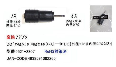 DC 異径変換アダプタ(メス:外径5.5mm内径2.1mm-オス:外径2.35mm内径0.7mm)