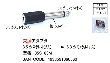 オーディオ変換アダプタ φ3.5ステレオ(メス)-φ6.3モノラル(オス)