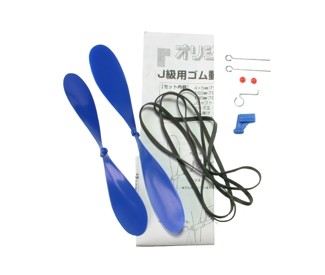 セット内容:15cmプロペラ×1本・18cmプロペラ×1本・4mm×5mmプラメタル×1個・ゴム掛け×1本・Jシャフト×2本・ビーズ玉×2個・動力ゴム(約1mm×約3.5×約260mm)×2本