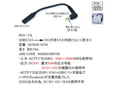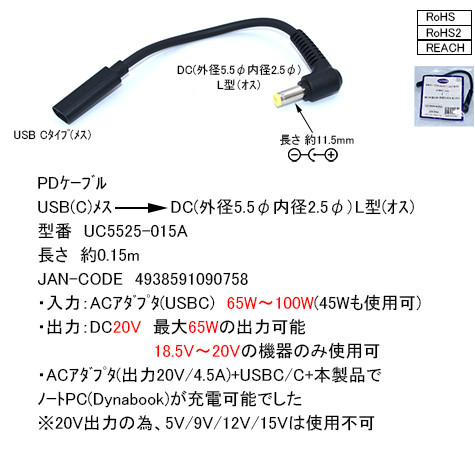 PDケーブル 20V出力 (18.5V~20V専用) USB(C)メス→ DC(外径5.5φ 内径2.5φ)L型(オス)0.15m