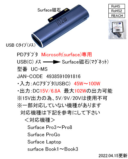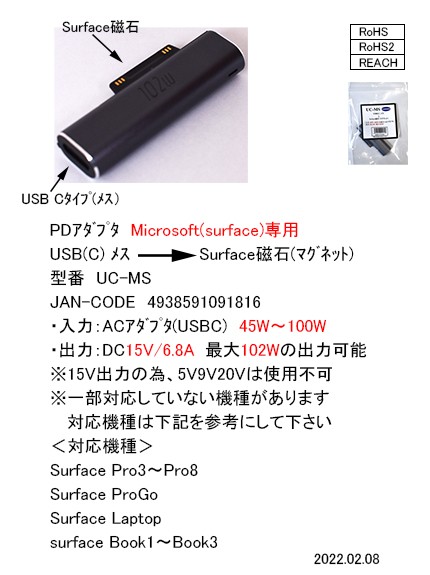 PDアダプタ Microsoft(surface)専用 USB(C)メス→Surface磁石(マグネット)