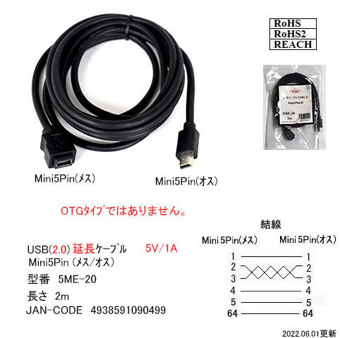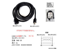 USB2.0 miniB(オス)-miniB(メス)ケーブル 2.0m