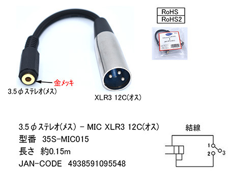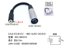 3.5φステレオ(メス)-MIC XLR3 12C(オス) 約0.15m