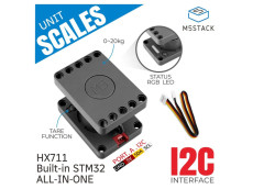 24 bit A/Dチップ HX711を搭載し、高精度な計量用に設計されたM5Stack用計量ユニットで、20 kgまで測定が可能です。STM32F030マイクロコントローラを内蔵し、風袋引きボタンおよびプログラム可能なRGB LEDも付いています。電子はかりとして、体重計やキッチンスケール、製品の個数計測にも利用できます。