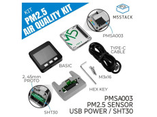 温度・湿度、空気質を気軽に計測・モニターできるM5Stack Basicベースの空気質センサキットです。M5Stack Basic本体、SHT30温湿度センサ、PM2.5ベース(PMSA003デジタル粒子濃度センサ搭載)などから構成され、温度・湿度・粒子濃度を容易に測定・モニターできます。