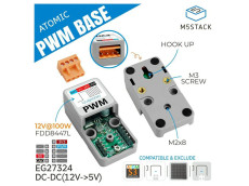 ATOMシリーズメインコントローラ互換の単一チャンネルPWM制御DCドライバです。12〜24 VのDC電源入力に対応します。出力信号のデューティサイクルは、内蔵のMOSFETスイッチにより制御されます。最大負荷容量は12 V@100 Wで、内蔵のDCDC降圧回路より、入力電源で負荷を駆動しながら、デバイス全体に電力を供給することができます。