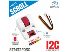 マウスのスクロールホイール風ロータリーエンコーダ拡張ユニットです。ホイールクリック用のスイッチ、マイコン内蔵型RGB LEDも内蔵しています。内蔵の32 bitマイコン(STM32F030)で制御されるので、M5Stack等のホストとはGroveケーブル(I2C)だけで接続できます。スケール値制御や音量調整などの用途に適しています。