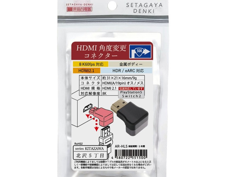 HDMI 2.1規格に対応し、8K60fps・4K120fpsの超高解像度映像伝送を実現するHDMI角度変更コネクター。上下左右4方向のバリエーションをお選びいただけます。