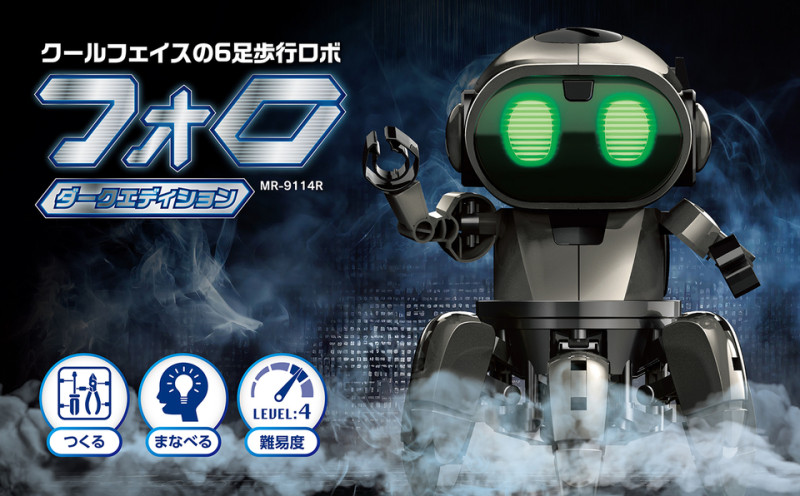 フォロ ダークエディションは、緑に光る目と音のギミックが特徴の、6足歩行のロボット工作キットです。