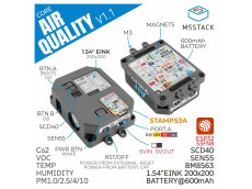 M5StampS3Aが搭載され、低消費電力で稼働する空気質モニタリング用デバイスです。SEN55空気質センサとSCD40 CO2センサにより、PM1.0、PM2.5、PM4、PM10粒子、温度、湿度、VOC、CO2濃度が測定可能です。