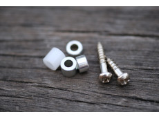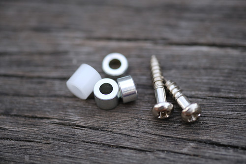 '59年ごろから使われた鉄製のものが高さ2mm、3mm、4mmの3個。'65年ごろから使われた背の高いものが1個、スペーサー登場以前にストリングツリーの固定に使われていた短いサイズのスクリューと長いサイズのスクリューが1本ずつ付属します。
