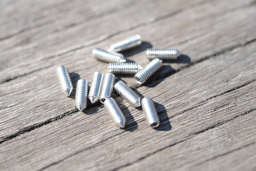 通常のくぼみ先(cup point)タイプの弦高調整ネジとは異なり、ネジの先端がとがっています。弦振動が点でブリッジに伝わるため、音抜けと分離感が向上します。あまり知られていませんが、ハイエンドギターの低音弦側サドルに密かに使用されています。