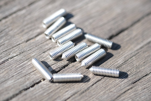 通常のくぼみ先(cup point)タイプの弦高調整ネジとは異なり、ネジの先端がとがっています。弦振動が点でブリッジに伝わるため、音抜けと分離感が向上します。あまり知られていませんが、ハイエンドギターの低音弦側サドルに密かに使用されています。