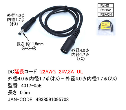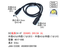 【取寄品】DCコード 延長用(外径4.0mm内径1.7mm) 0.5m