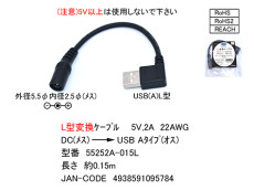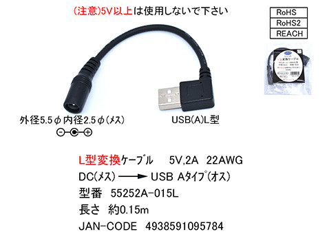 【取寄せ品】DC(メス)→USB Aタイプ(オス)L型変換ケーブル 外径5.5内径2.5 5V2A 約0.15m