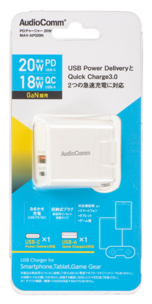 【大阪店のみ取扱品】PDチャージャー(20W PD USB-C/18W QC USB-A/GaN採用/収納式プラグ/ホワイト)