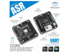CI1302ベースのAIオフライン音声認識モジュールです。マイクとスピーカーを内蔵、エコーキャンセル(AEC)により環境ノイズの影響が低減されます。工場出荷時に英語のウェイクアップワード/コマンドがプリセットされ、ユーザー定義の語彙に置き換えると、日中韓英のワードで最大300コマンドまでカスタマイズできます。通信はUARTで、DIPスイッチによりホスト側のUARTピン配置に合わせて切り替えられます。