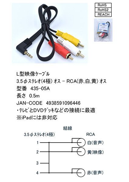 L型映像ケーブル φ3.5ステレオ(4極)オス-RCA(赤白黄)オス 0.5m