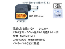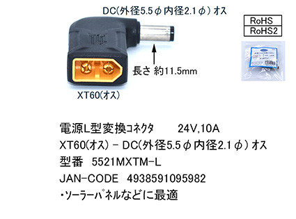 電源L型変換コネクタ XT60(オス)-DC(外径5.5Φ内径2.1Φ)オス